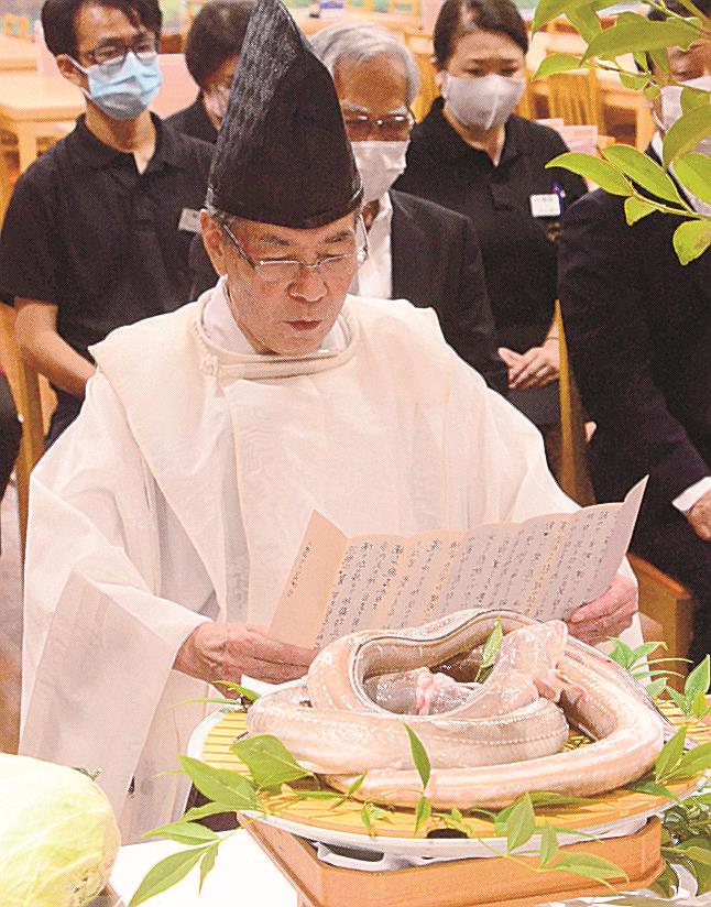 語呂合わせで「アナゴの日」となる5日、全国有数の水揚げ量を誇る大田市の国民宿舎さんべ荘(三瓶町志学)でアナゴを供養する鎮魂祭が初めて執り行われ、施設の代表者や従業員が感謝をささげた。1日限りの特別定食の販売もあった。