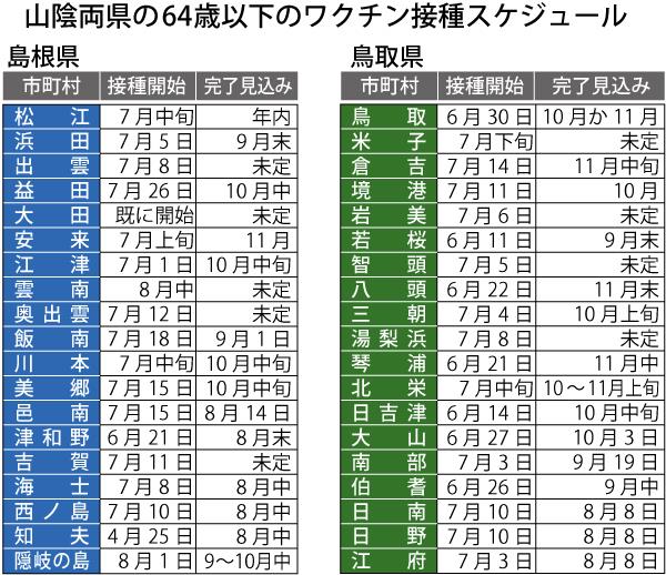 新型コロナウイルスワクチンで、一般接種の完了時期が山陰両県の市町村で二極化しそうだ。8月に全希望者への接種完了とする町がある一方、人口の多い市部を中心に完了時期を明示できていない。高齢者と比べて予約率が伸び悩むほか、国からのワクチン供給のめどが立たないからだ。子どもへの働き掛けも課題で、どれだけ接種率を上げられるか、見通せない。 (取材班)