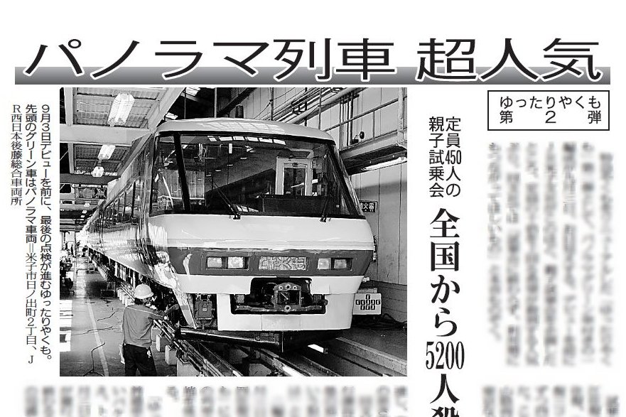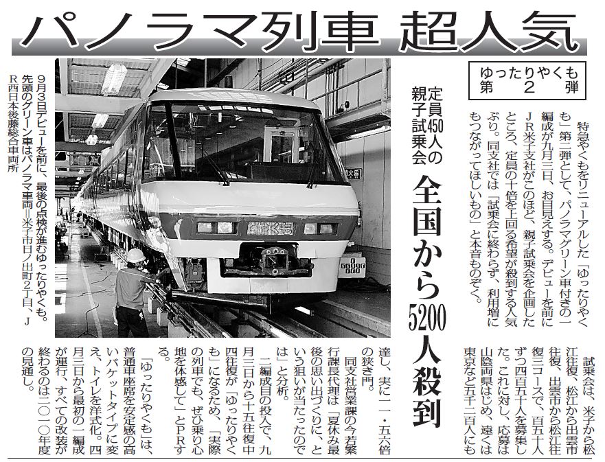 特急やくもをリニューアルした「ゆったりやくも」第二弾として、パノラマグリーン車付きの一編成が九月三日、お目見えする。デビューを前にJR米子支社がこのほど、親子試乗会を企画したところ、定員の十倍を上回る希望が殺到する人気ぶり。同支社では「試乗会に終わらず、利用増にもつながってほしいもの」と本音ものぞく。