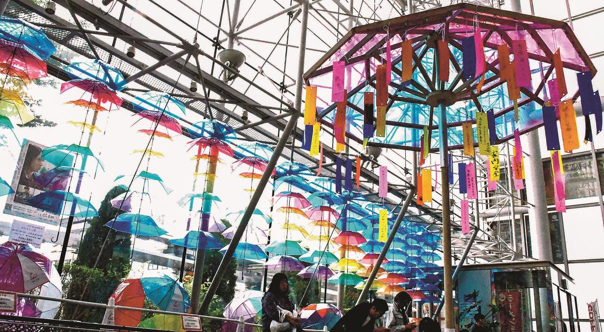 1階のアトリウムの窓ガラスには、赤や青、緑などの傘を組み合わせたアンブレラボールが飾られ、陽光を受けて光っていた。