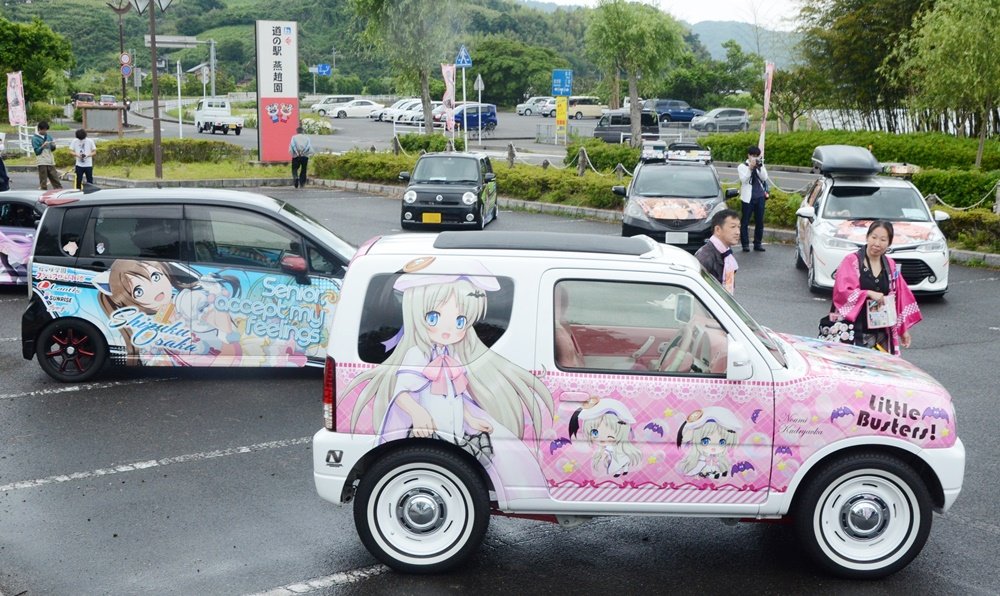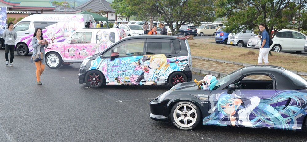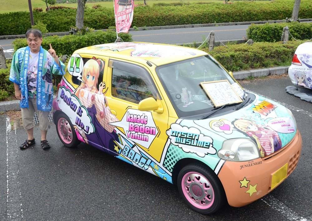 アニメなどのキャラクターを車体に描いた「痛車」が集うイベントが2日、鳥取県湯梨浜町引地の道の駅燕趙園であった。各地の温泉地を擬人化した「温泉むすめ」をはじめ「ウマ娘」「ラブライブ!」など人気コンテンツの推しキャラを描いた車とバイク計17台が来場者を楽しませた。