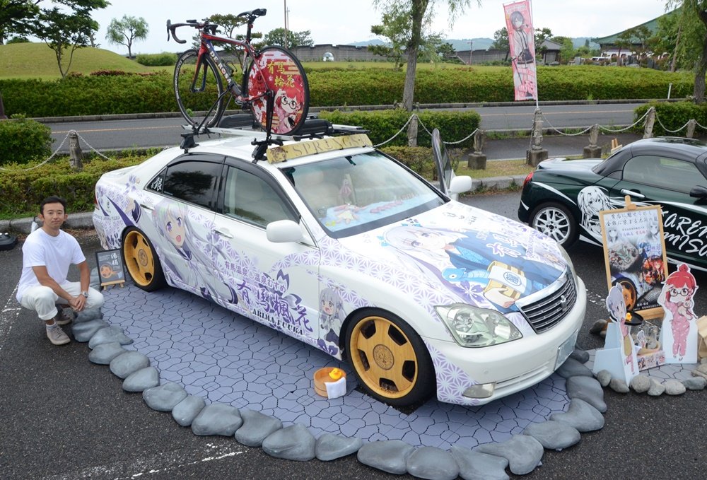 特に目を引いたのが、有馬温泉(神戸市)の温泉むすめ「有馬楓花」を描いた痛車。楓花の姉「有馬輪花」を描いた自転車を屋根に乗せ、ホイールは風呂桶風のデザインで、温泉を模した展示ベースも手作りという力の入れよう。温泉地PRにつながるとあって旅館や飲食店がスポンサーになり、広告も記してあるのが面白い。
