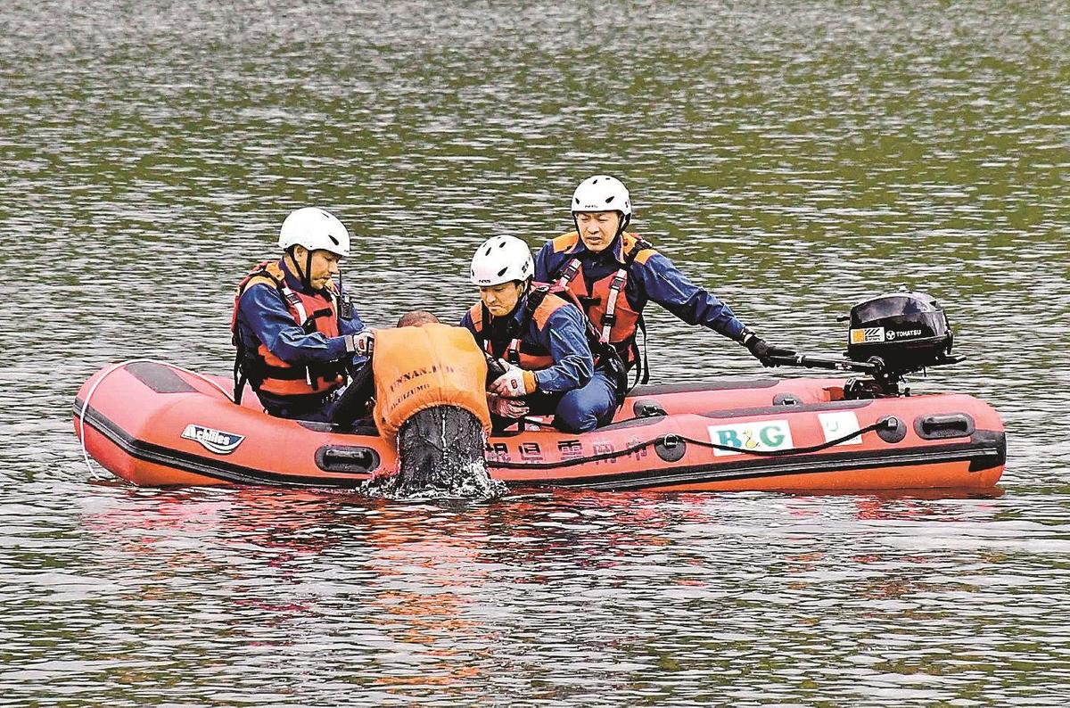 【雲南・奥出雲】川などの増水を想定した警察や消防などによる救助訓練が4日、雲南市と島根県奥出雲町にまたがるさくらおろち湖(尾原ダム)であった。署員や雲南市職員らがドローンや救命ボートを使い、捜索や救助の手順を確認した。