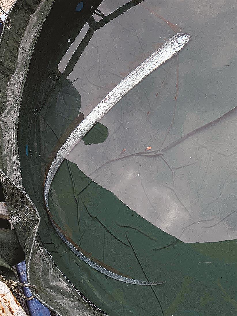 江津市でこのほど、深海魚のリュウグウノツカイが生きた状態で見つかった。沖合の定置網にかかっていた。発見後、数時間で死んだが、しまね海洋館アクアス(浜田市・江津市)によると、生きた状態で見つかるのは珍しいという。