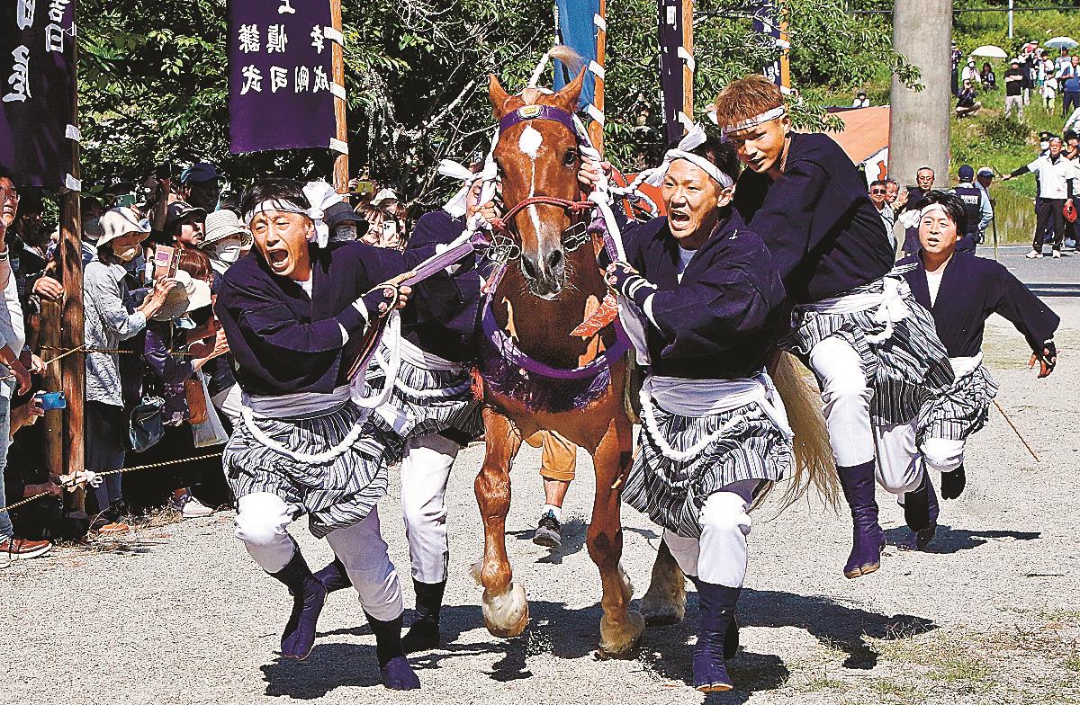 午後3時ごろに始まった境内への馬入れでは、6人の馬付きが大きなかけ声で神馬を全力で走らせて勢いよく随神門をくぐり、拝殿前にたどり着いた。
