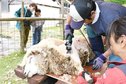 南米原産でラクダ科の動物、アルパカの毛刈りが6日、米子市岡成、観光牧場「大山ト...