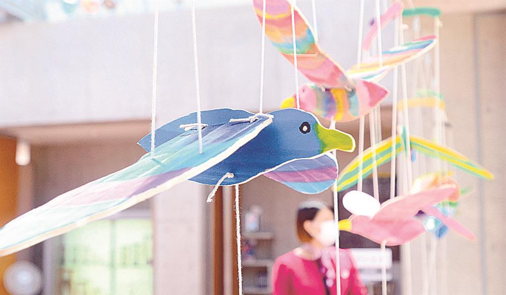 【大田】大田市仁摩町天河内の仁摩サンドミュージアムが、島根県産の杉を材料とした市内の小学生制作の鳥形木工玩具を展示している。黄、緑、青、ピンクなど児童が思い思いの色を塗ったカラフルな22体が来館者の目を引いている。11月10日まで。