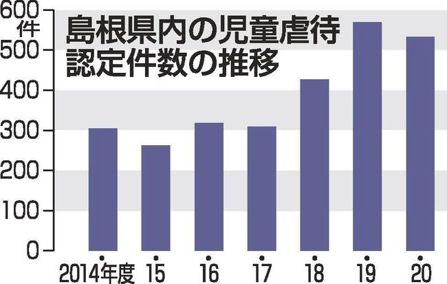 20年度の認定件数は過去最多だった19年度の569件から36件減った。内訳は児相364件(前年度比31件減)、市町村292件(14件減)で、重複分は123件。虐待種別では、殴る蹴るといった身体的虐待が児相80件(52件減)、市町村85件(36件減)。暴言や家族に対する面前での暴力といった心理的虐待が児相191件(5件増)、市町村154件(45件増)だった。