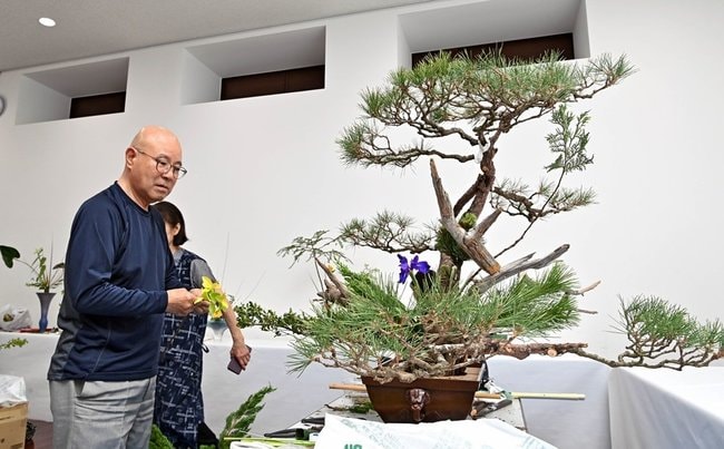 3社中の21人が計25点を出展する。ケムリソウやカキツバタ、ナツハゼなど季節の草花が、伝統的な立花や生花、定まった型のない自由花と多彩な花型で生けられ、会場を彩っている。