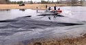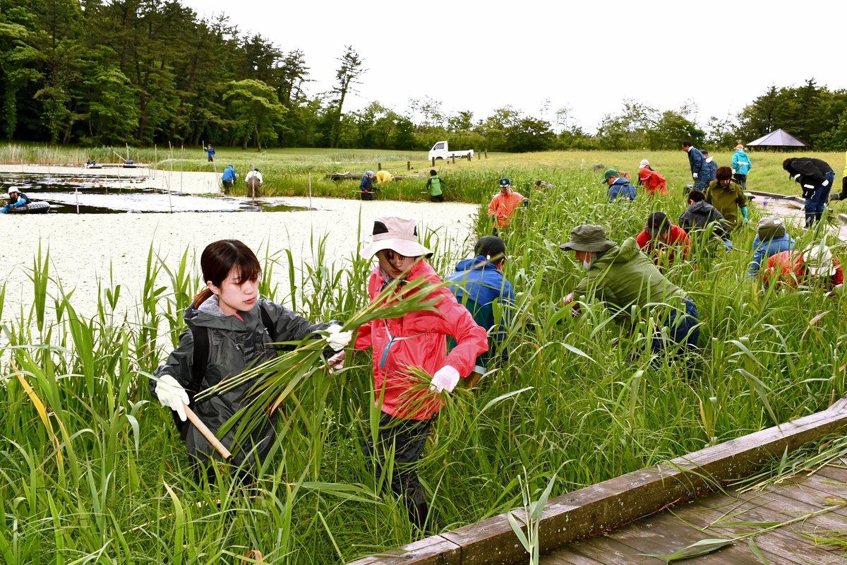 カキツバタが多く植わる池の縁には、ヨシが既に人の背丈ほどに成長し、カサスゲなどの雑草も勢いを増しており、参加者は鎌を使って刈り取った。水面には外来種のセイヨウスイレンもあり、胴長を着て池の中に入り、手作業で一つ一つ取り除いた。