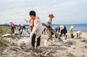 松江市千鳥町の宍道湖岸では約400人が清掃した。火ばさみやごみ袋を手に、流れ着いた木や雑草、空き缶などを拾い集めた。県民参加型ミュージカル「あいと地球と競売人」に関わる仲間と参加した頼田朋紀さん(11)は「思ったよりもごみが少なかった。ポイ捨てする人が減っているのだと思う。少しでもきれいになるとうれしい」と話した。