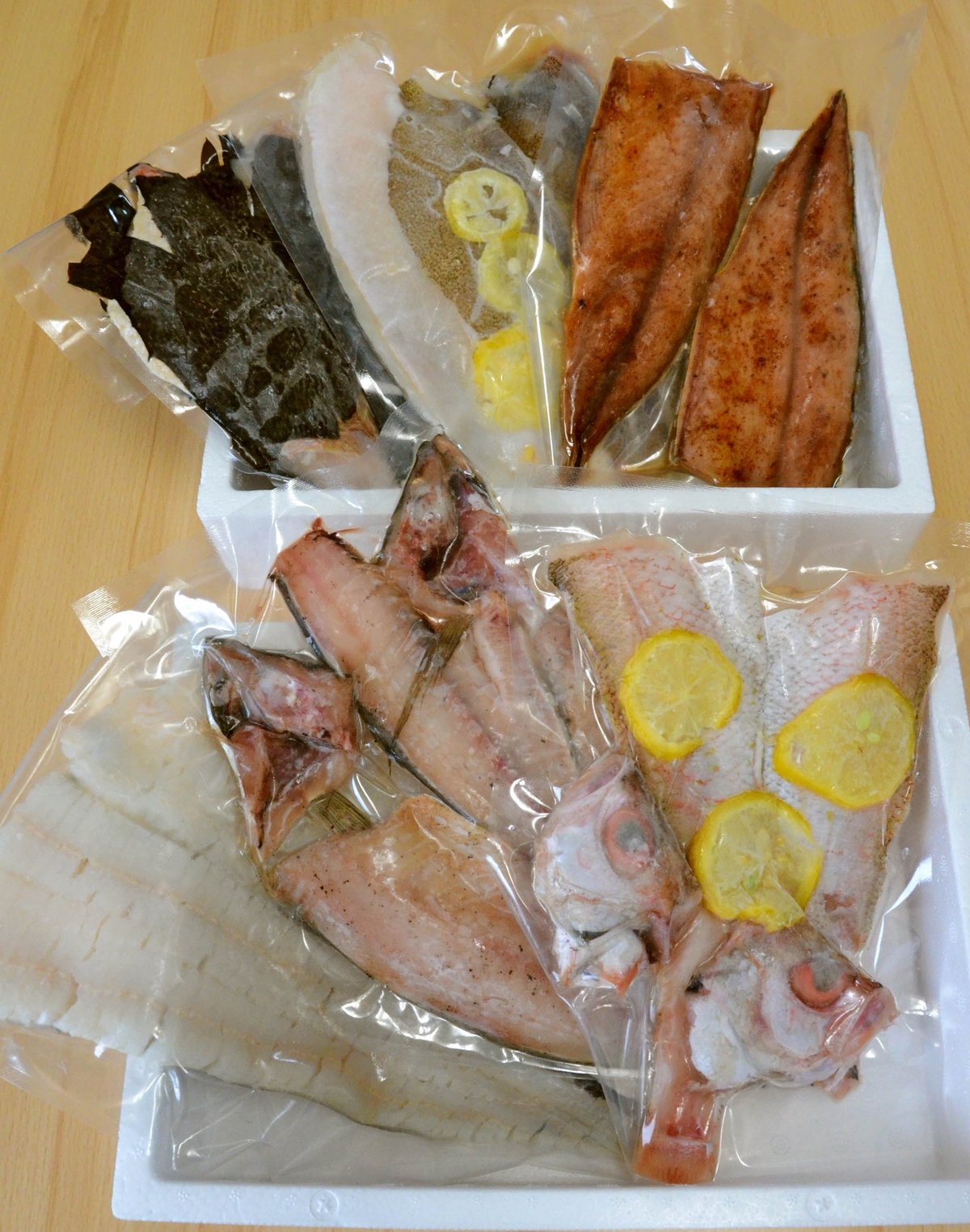 林シェフは、カレイ(1尾1620円)、レンコダイ(同1620円)、サバ(同1188円)、矢口シェフは、ノドグロ(同2376円)、アナゴ(同2180円)、アジ(同972円)の3種類ずつをそれぞれ監修。カレイはシャンパンとユズを加え、酸味と爽やかな香りが特徴で、レンコダイは海草を使い、洋風の昆布締めに仕立てた。アジは薫製、ノドグロはユズとブランデーで酸味と豊かな香りを引き出した。