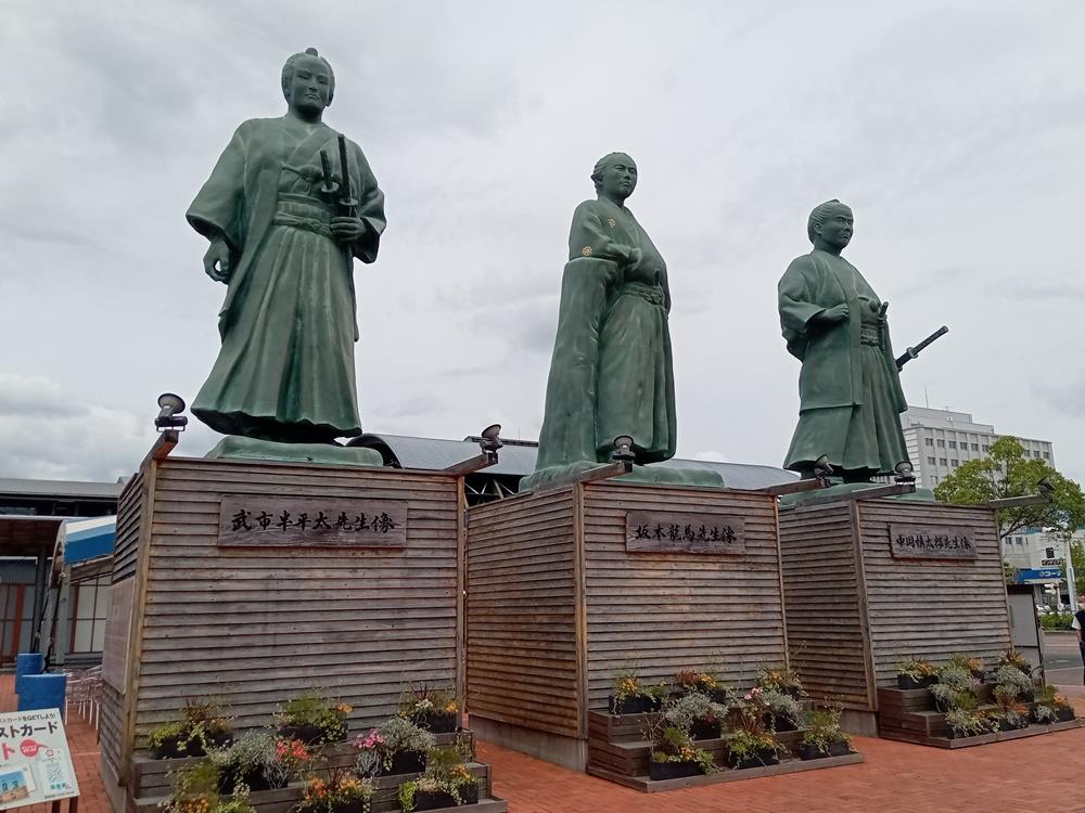「またか」と笑われそうだが先日(9日付)に続き、今年の干(え)支(と)にまつわる「龍」の話から。と言っても今回の主役は、浜田市出身でパリ五輪日本代表に決まった陸上男子3000メートル障害の三浦龍司選手(22)ではなく、幕末の土佐藩士・坂本龍馬▼高知県は、香美市出身で人気アニメ『アンパンマン』の作者・やなせたかしさん(1919~2013年)、昨年の朝ドラ『らんまん』のモデルになった佐川町出身の植物学者・牧野富太郎博士(1862~1957年)をはじめ偉人の宝庫。その中でも知名度と人気は龍馬が断然トップだろう▼先週、会合で高知市に出張した。台座を含めた高さが13・5メートルの龍馬像が立つ景勝地・桂浜に向かうまでもなく、JR高知駅を降り立つと、同じ幕末の志士・中岡慎太郎、武市半平太と並んだ像が迎えてくれた▼7年前、そんな高知のヒーローが教科書から消えそうになる危機があった。大学と高校の教員でつくる研究会が、日本史の教科書に登場する歴史用語を精選すべきだと提言。削除候補に龍馬を入れたものの、県知事の反対表明もあり、事なきを得た。県民が龍馬を敬愛している証しだろう▼会合の後、市内にある記念館を訪ねた。龍馬の手紙や関連資料が展示される中、龍馬の筆跡をシールにして貼り合わせる名刺作りコーナーを見つけた。今年で没後157年。高知では龍馬は今も、龍の如(ごと)く大忙しのようだ。(健)