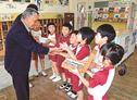 海潮小であった贈呈式で、運営委員の2人にろうそく86個とお礼の手紙を手渡した。3年の高島史弥(ふみや)さん(8)は「ホタルをたくさんの人が見ることができるように、ろうそくを使ってほしい」と話した。
