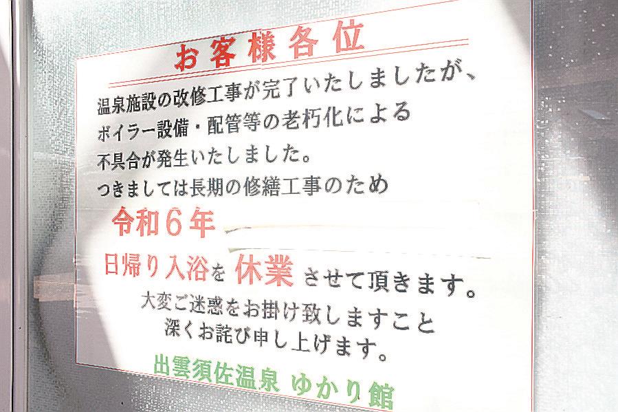 出雲市佐田町原田の宿泊温泉施設「出雲須佐温泉ゆかり館」の建物と土地が、日本年金機構に差し押さえられていることが分かった。経営する30代の男性社長と3月末以降、連絡が取れておらず、社会保険料滞納の可能性がある。施設は昨年12月に改修工事のために休業中。再開の見通しは立っていない。