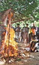 忘れられない故人に送る「天国への手紙」のおたき上げが16日、松江市東出雲町揖屋の黄泉(よもつ)比良坂(ひらさか)であった。古事記で現世と死者の世界の境界と伝わる場所に県内外から約200人が集まり、1年間で集まった1万2200通を火にくべた。