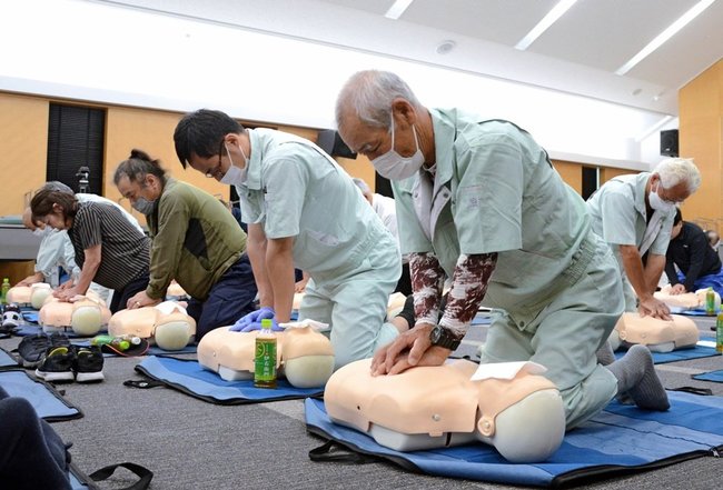 協同組合の8社から38人が参加。松江市消防本部の職員を講師役に座学と実技の両面で理解を深めた。実技では人形を使い、胸骨圧迫を体験。意識や呼吸の確認などの後、胸部が5センチほど沈む強さで1分間に100回程度押し込んだ。自動体外式除細動器(AED)の操作も学んだ。