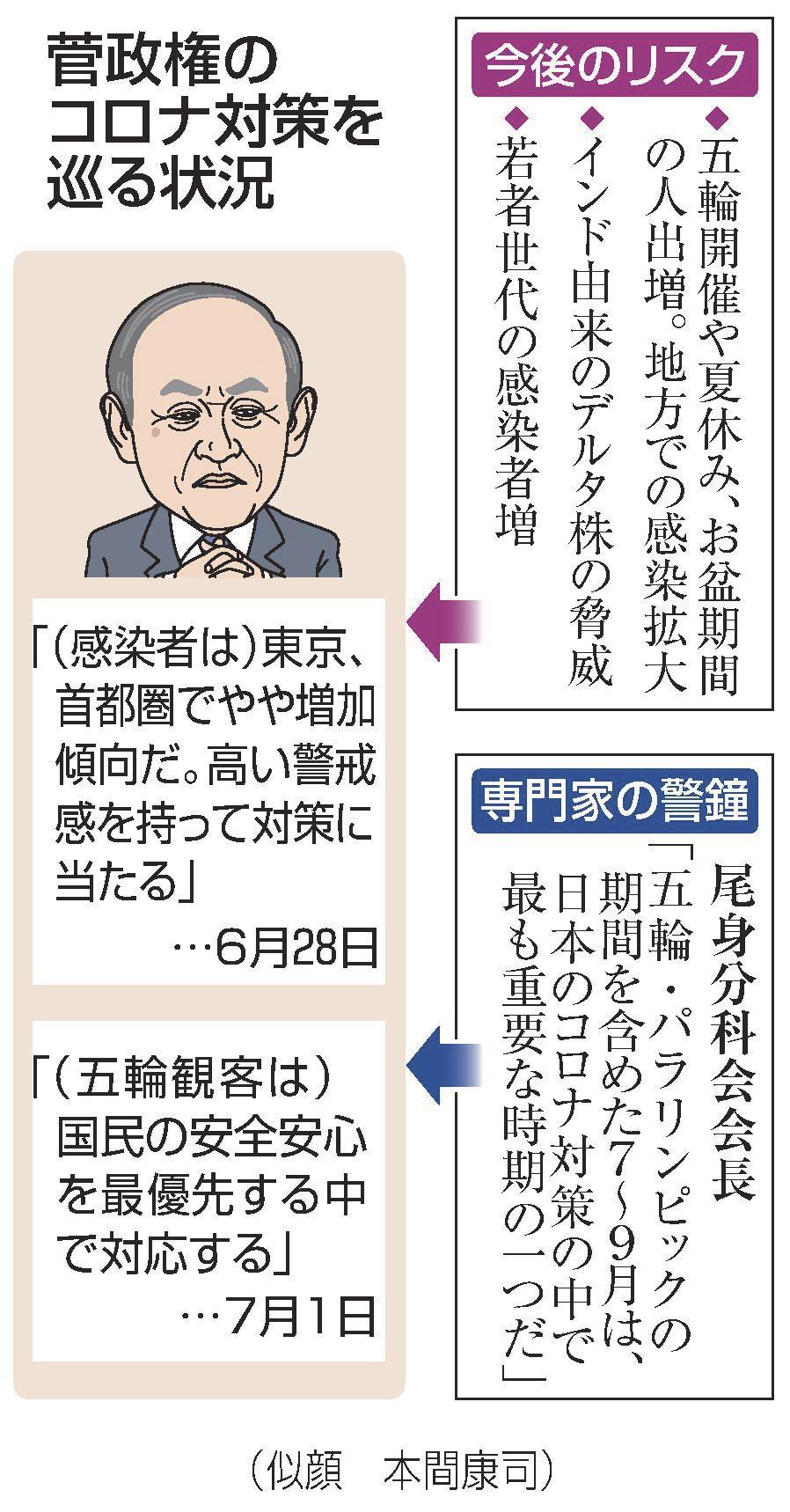 菅政権が、東京への新型コロナウイルス緊急事態宣言の発令へ追い込まれた。想定外の感染者急増により、まん延防止等重点措置延長で乗り切れるとの戦略はあえなく崩壊。「第5波」への懸念が強まる中、リスクを抱えて東京五輪期間に突入する。専門家はインド由来のデルタ株の脅威や夏休み期間中の地方への感染拡大に危機感を訴える。都内の五輪会場は無観客の方向となり、菅義偉首相がこだわった「観客入り五輪」も崩れ去る可能性が大きくなった。