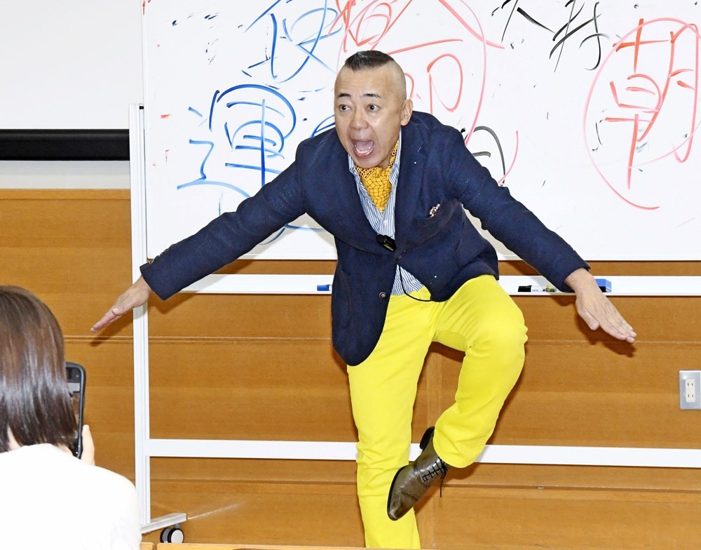 お笑い芸人のゴルゴ松本さん(57)が島根県立大出雲キャンパス(出雲市西林木町)の開設30周年記念講演で訪れ「命の授業」を開いた。漢字の「命」を模したポーズで知られる松本さん。日本語や漢字についてユーモアを交えた独自の解釈で、言葉に込められた深い意味を伝え、看護栄養学部の学生たち200人をくぎ付けにした。授業での「ゴルゴ語録」を紹介する。