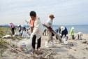 同町御津の海岸では地元漁師やボランティア、鹿島中の生徒ら約60人が火ばさみやごみ袋を片手に1時間かけてごみを集めた。生徒たちは汗を流しながら砂浜に埋まる網やプラスチック、ペットボトルなどを拾い、45リットルの袋約40袋分のごみを回収した。