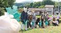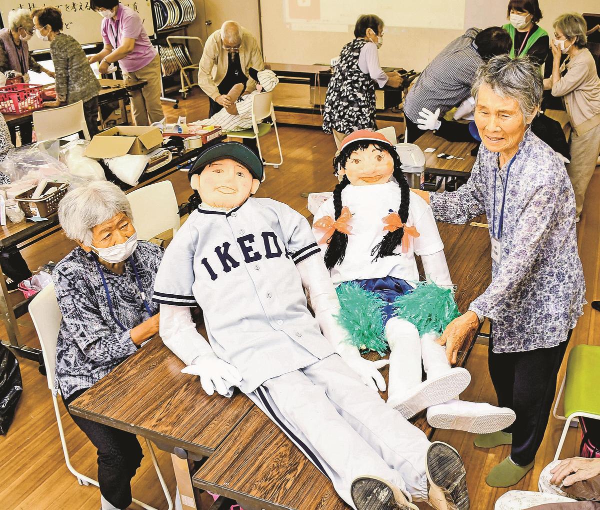 作業は廃材で骨組みを作り、梱包(こんぽう)材などを巻いて肉付けした。2023年3月に閉校した旧池田小の体操服をまねた上着や地元スポーツ少年団の野球のユニホームなどで着飾った。