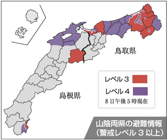 山陰両県では降り始めから8日夕まで、多い地域で計440ミリの記録的降雨となった。倉吉市大原の「中山精工鳥取工場」の脇では午後3時ごろ、大規模な土砂崩れが発生。土砂は工場内に流れ込み、男性3人が巻き込まれた。