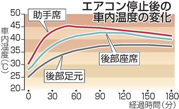 銀色に塗装された乗用車の助手席と後部座席、後部の足元の3カ所に温度計を設置。設定温度を最低、風力を最大にしたエアコンを30分間稼働させた後、午後2時40分にエンジンを止め、同5時40分までの3時間計測した。
