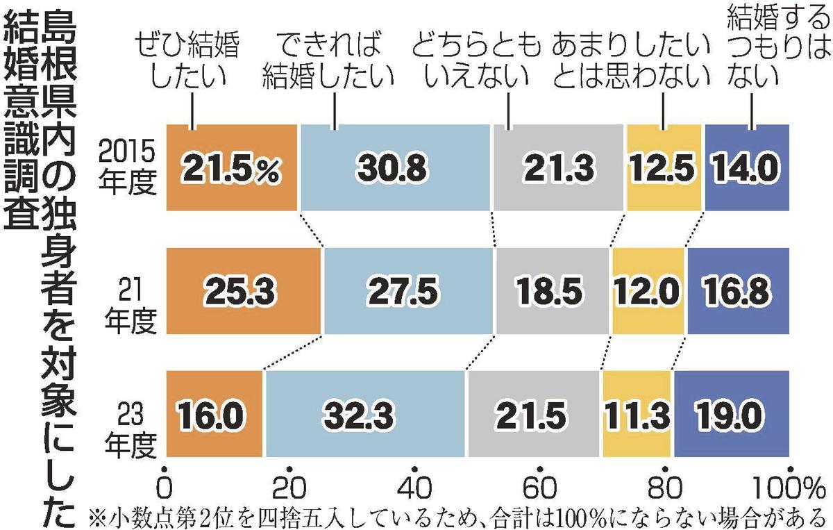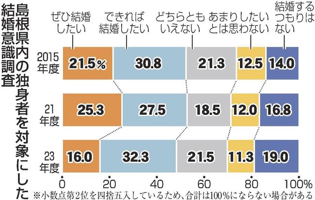相手がいないし、婚活は面倒くさい-。2023年度に島根県が県内の独身者を対象に実施した意識調査で、結婚を望む男性は43・5%となり、21年度の前回調査に比べて14・0ポイント減少した。20、30代の低下が顕著で、結婚志向の割合は女性を下回った。