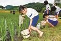 児童は楠本さんから、人間の暮らしは多様な生き物の活動に支えられ、田んぼは生物を育む宝庫だと教わった。無農薬、無化学肥料の有機田んぼを調べる班と、減農薬の田んぼを調べる班に分かれ、虫網を使って生き物を捕まえた。