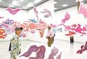 須山留実子さんの木版画「予測不可能な未来へ進む」は作者自身を干支(えと)の辰(たつ)に例えた作品。竜は鮮やかなピンクや紫で描かれ、丸みのあるラインで女性らしさを表現している。