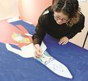 小学4年生の桑原しずくさんは、鳥をモチーフにした絵が中心。「黄いろい花の鳥」は黄色い帽子をかぶった青い鳥を粘土で表現した。いずれも自分の好きなものを自由な発想で創作した作品が並ぶ。