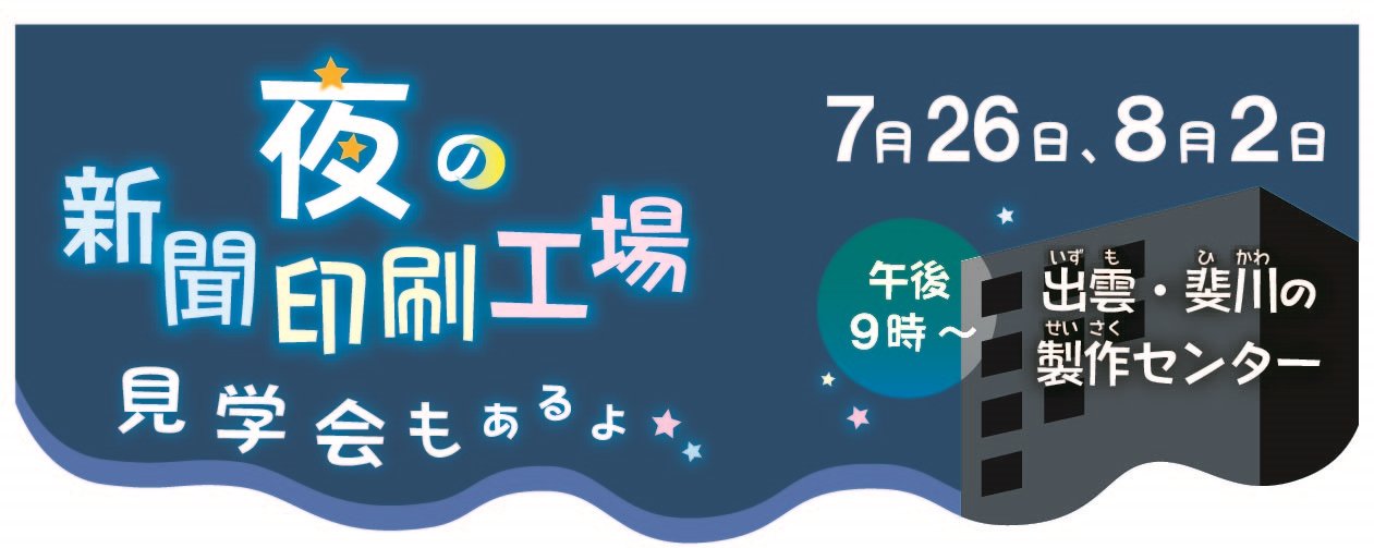 山陰中央新報製作センター(出雲市斐川町上庄原)は、夜の新聞印刷工場見学会を、いずれも金曜日の7月26日と8月2日に、同製作センターで開きます。時間は午後9時~同11時半。巨大な印刷機械が、ごう音とともに高速で刷り上げる作業や、新聞をトラックに積み込む発送作業を見ることができます。小中学生とその保護者を対象に参加者を募集します。