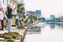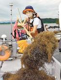 松江市浜乃木8丁目、松江商業高校の生徒がこのほど、同市東茶町の宍道湖の船泊まりで水草などを刈る探究授業に参加し、宍道湖の環境を学んだ。