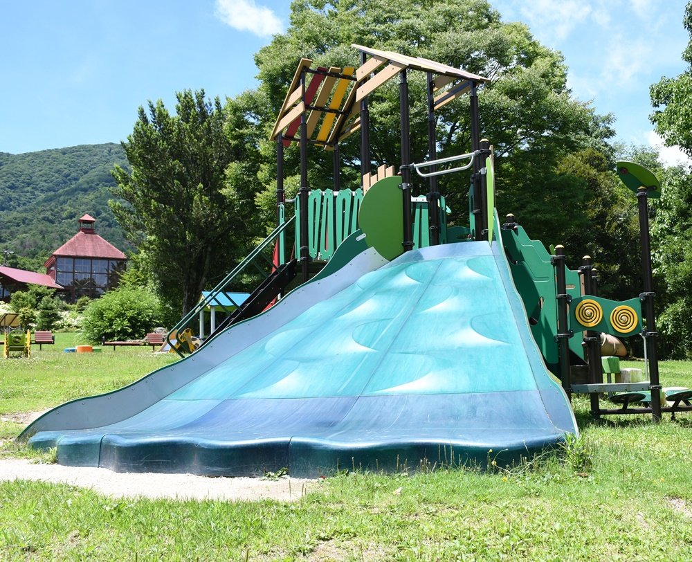 いずれの遊具も駐車場から階段を降りてすぐの場所にあるのがうれしい。駐車場近くのクラフト館では、公園内で育てたハーブを使ったソーダや町産米粉を使ったフィナンシェを扱い、飲食休憩が取りやすい。駐車場から道路を挟んだ向かいに、自然放牧牛乳を使ったソフトクリームやジェラートを販売するカフェ「mui(ミューイ)」もある。