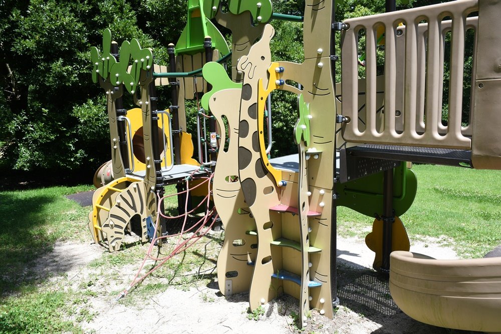 フォレストアニマルワンダーは滑り台のついたデッキをロープの足場でつないだ遊具。所々にサルやトラ、キリンにシマウマといった動物のパネルがあり、子どもを喜ばせる。