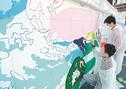 縦約90センチ、横約2・5メートルのガラス計42枚をキャンバスにして、オオサンショウウオやトマトなど日南町の自然をテーマに絵を描いた。6、7の両日、朝倉さんと町民ボランティアで輪郭線を描く作業があり、約20人が参加した。