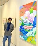 2023年9月、センターの野外イベント広場が芝生化されたのをきっかけに、行ってみたくなる空間をつくろうと町が「みんなの中庭アートプロジェクト」を企画。大山町在住の画家、朝倉弘平さんが5月のワークショップで、園児や小中学生のアイデアを基にデザインを練った。