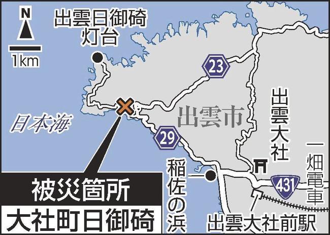 出雲日御碕灯台がある観光地の同地区には、発生時に宿泊者65人や宿泊施設の従業員21人が滞在しており、この日、ほぼ全員が船などで避難した。