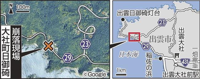記録的大雨で県道の一部が崩落し、235世帯の孤立が続いている出雲市大社町日御碕地区の道路復旧を巡り、県道を管理する島根県は11日、本格的な復旧に先立ち、片側交互通行ができる仮設道路を設ける考えを示した。また同日、海路で食料などの支援物資が届いた。