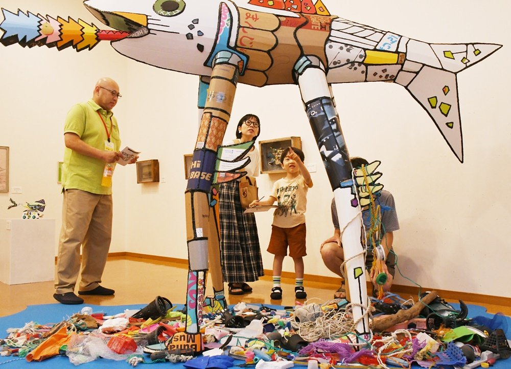 海をテーマにした体験型の美術展「海とあそぶアート展」が13日、浜田市野原町の市世界こども美術館で始まった。親子連れが海岸漂着物などでできた作品を間近に見て触れて、海の困り事について考えた。