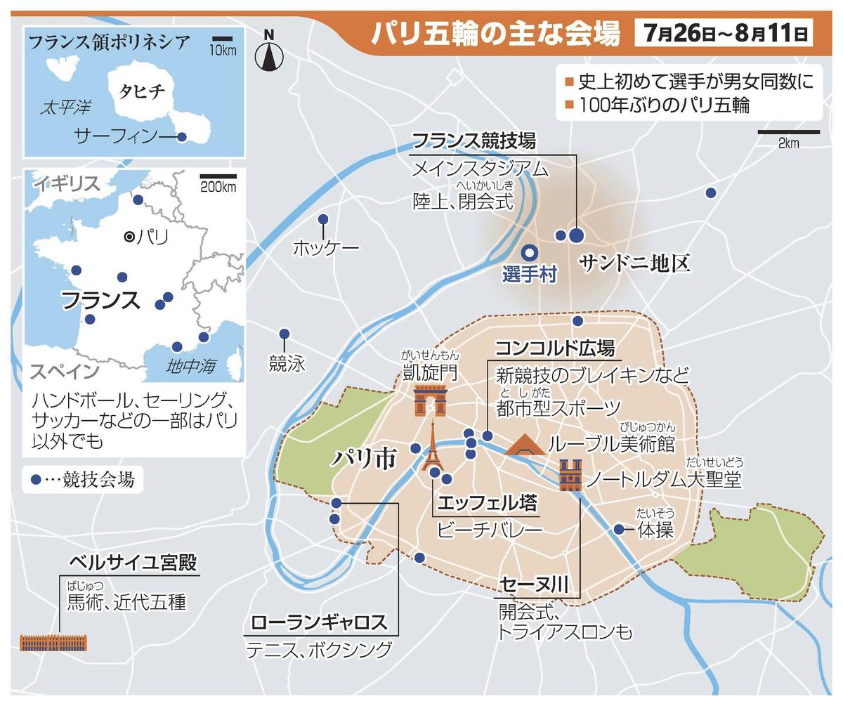 パリでの五輪は3度目です。前回は1924年に開かれており、ちょうど100年ぶりです。五輪はいつもは4年おきに開かれますが、前回の東京五輪はコロナの影響(えいきょう)で2020年から21年に延期(えんき)されました。今大会は東京五輪から3年で行われます。