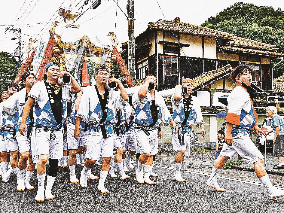 江津市江津町の山辺神社で14日、恒例の「江津祇園例大祭」があった。小雨が断続的に降る中、ねじり鉢巻きに法被姿の男衆50人がみこしを担いで勢いよく繰り出し、見物客が開運や無病息災を願って見守った。