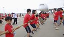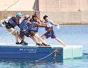 美保関町の夏の恒例イベントとして知られる大会は、地元有志でつくる美保関町海夏まつり実行委員会が主催。海上に浮かべた縦4メートル、横2メートルの二つの台船に各チームの5人が乗り、45秒間、綱を引き合って相手チームを海に落とすか、自陣に引き寄せた方が勝ちとなる。