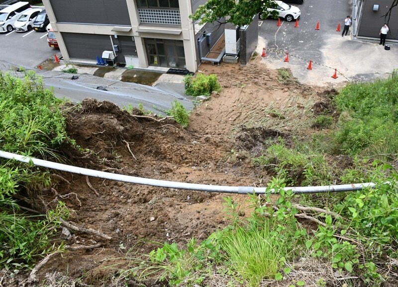 14日から15日にかけての大雨で国史跡・鳥取城跡(鳥取市東町2丁目)ののり面が崩壊した。現在、鳥取西高校がある三ノ丸御殿跡の背後で、かつて庭園だったのり面。長さ約10メートル、幅約5メートルにわたって崩れた。けが人や校舎などの被害はない。