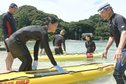 美保関町の夏の恒例イベントとして知られる大会は、地元有志でつくる美保関町海夏まつり実行委員会が主催した。海上に浮かべた縦4メートル、横2メートルの二つの台船に各チームの5人が乗り、45秒間、綱を引き合って相手チームを海に落とすか、自陣に引き寄せた方が勝ちとなる。