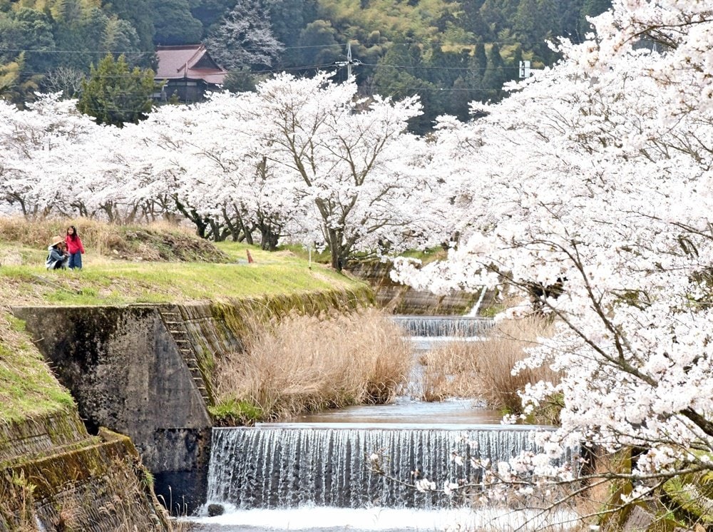町の中心を流れる祖式川の桜は40年近く前に住民たちが植樹した。両岸の農道沿いにソメイヨシノ約120本が植わり、堰堤(えんてい)を落ちる流水の景色と合わせて楽しめる。5年前から同会があらためて整備を進め、1・3キロのウオーキングコースの設定や樹木の手入れ、除草活動を続けている。