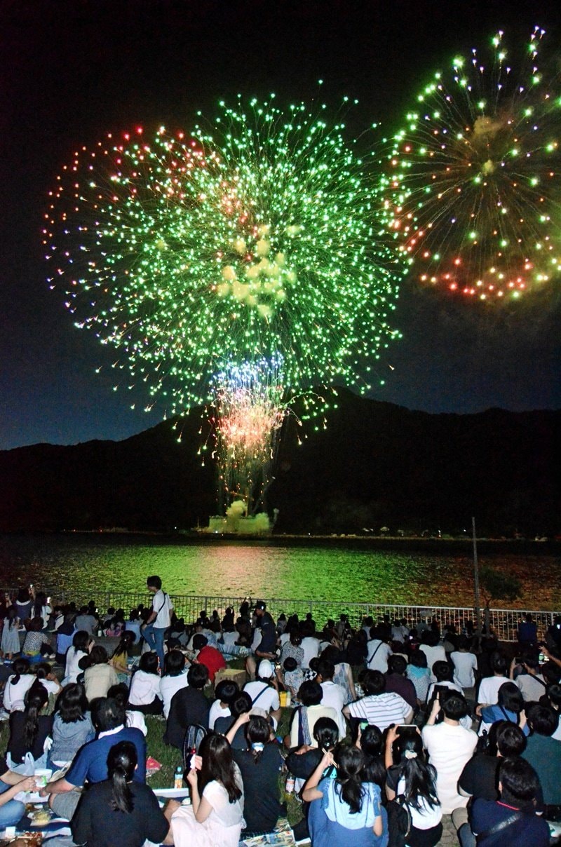 花火大会は午後8時から約30分間打ち上げられた。多くの見物客が音と光が織りなす夏の風物詩を堪能。大輪に歓声をあげ、写真撮影するなど思い思いに楽しんだ。