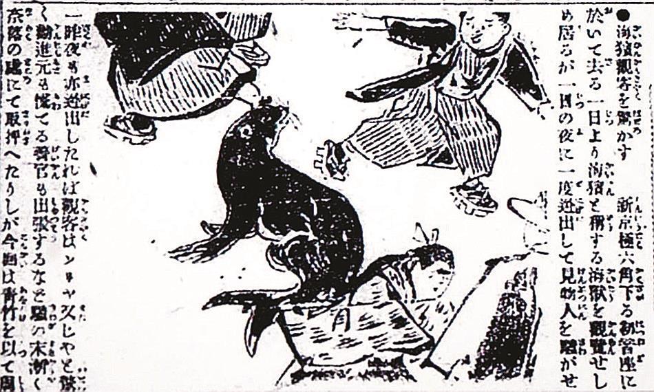 記事は京都日出新聞の02年3月3日付「海(狩の守が賓)(かいひん)観客を驚かす」。体長七尺(2・1メートル)のアシカが京都の見世物小屋で2度も逃げ出し、騒ぎになったと伝える記事で、「東京洋魚組合水産技師遠藤達造氏が二月十五日に日本海中無人の孤島リヤンコ島にて捕獲せしものなりと」と記載されている。
