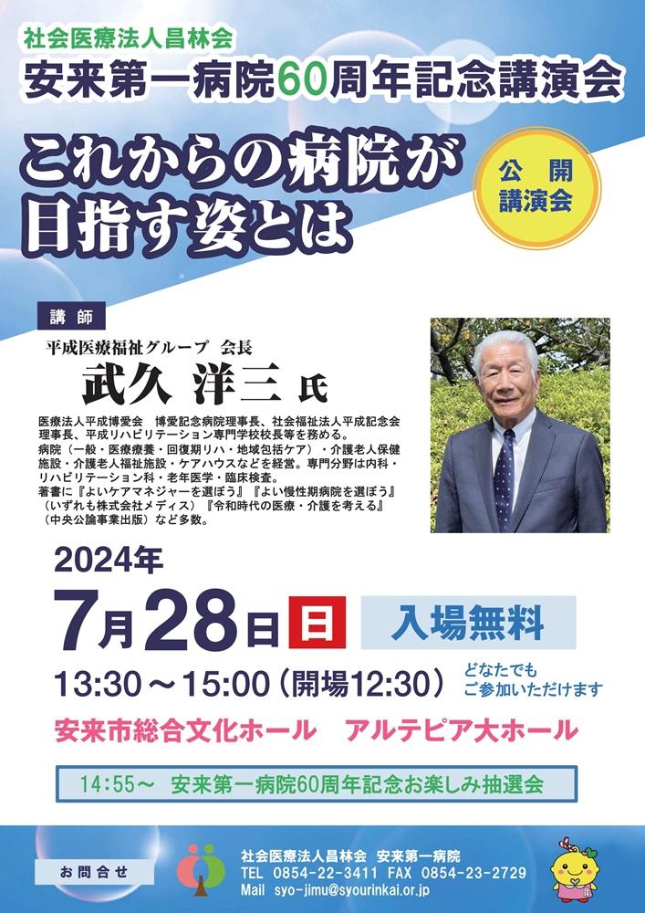講演会は午後1時半~同3時。社会医療法人昌林会(杉原建理事長)の安来第一病院開設60周年を記念し開く。講演会終了後には豪華景品が当たる抽選会がある。