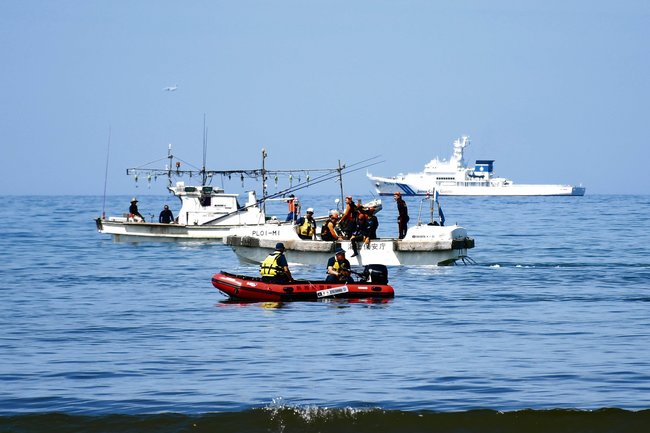 境海保によると、25日は午前6時ごろからヘリコプターや巡視船を出し、消防や警察などとともに約100人態勢で捜索に当たった。午後6時半まで続けたものの発見できなかった。夜間は巡視船で海上の監視を続け、26日朝から同規模で再開する。